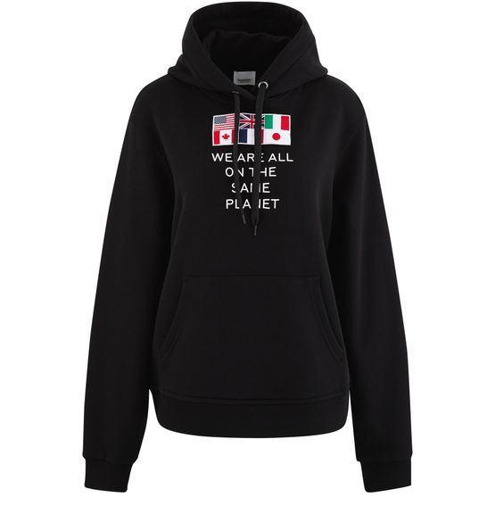 An oversized hoodie in loop-back cotton, enhanced with an embroidered flag appliqué and a raised slogan print.