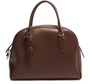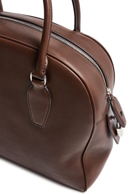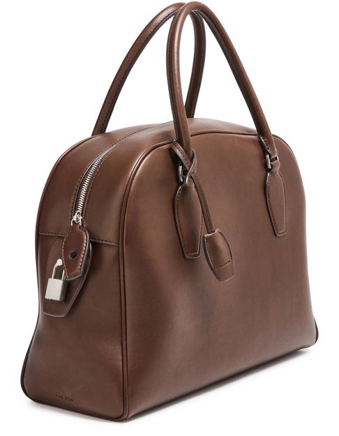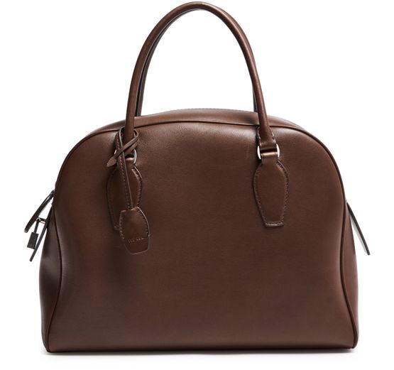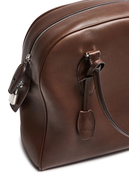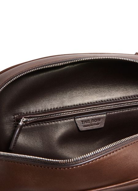 Introducing The Row's India 12 handbag, a masterpiece of modern elegance. Crafted from smooth leather, this shoulder bag features double handles and a large interior compartment. The zippered interior pocket and visible topstitching add functional sophistication, while the embossed logo and silver finish complete its refined allure.