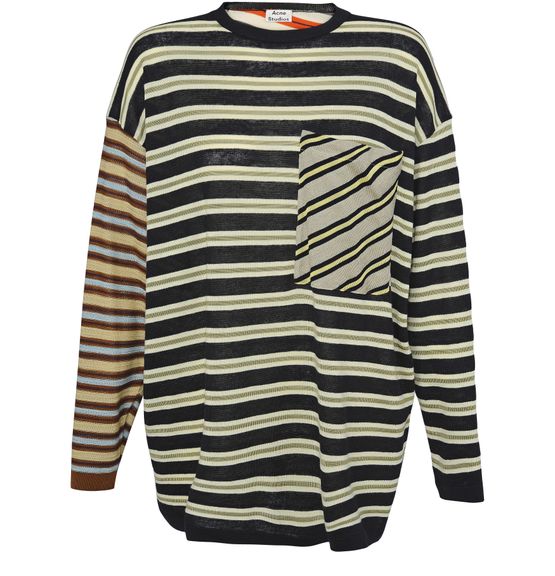 Fluid lines and horizontal stripes characterise the Kadine jumper by the Swedish brand Acne Studios. The right sleeve and the pocket give the whole thing an undeniable touch of originality.