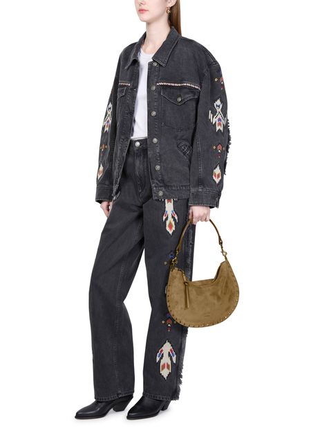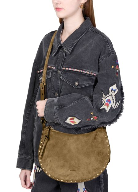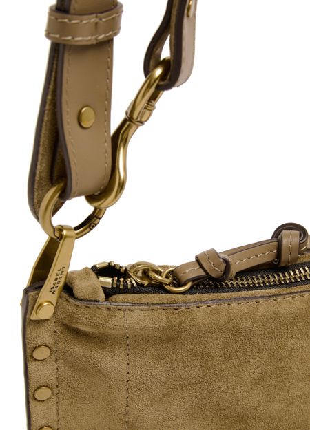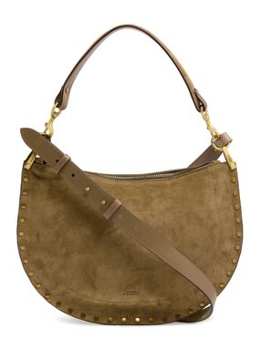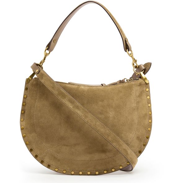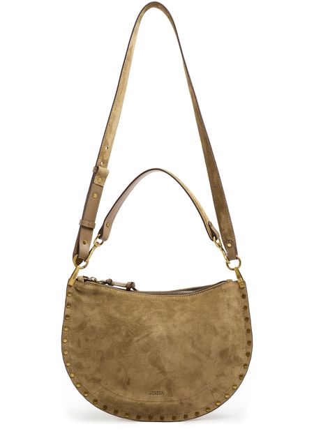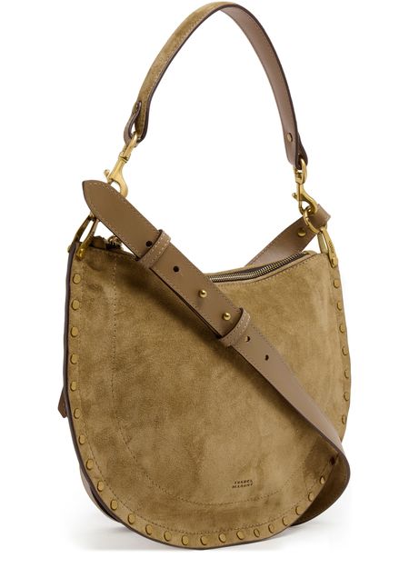 Unveil Isabel Marant's Oskan soft zipped bag, a masterpiece of suede craftsmanship. This hobo bag features a single handle and a thin, adjustable, detachable strap for versatile wear. Adorned with studded details and a zipper closure, it offers a single compartment with an interior pocket, all finished with gold-tone metallic details.