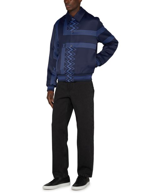 This distinctive bomber jacket displays the LV Karakoram motif, inspired by a vintage scarf, whose zigzag pattern evokes the peaks of the Karakoram mountain range. It is printed onto the indigo fabric with a technique known as discharge, which removes dye instead of applying it. Slightly padded and fully lined, it has snap buttons and a ribbed bottom hem and cuffs.