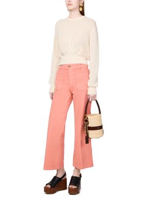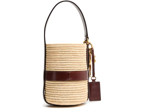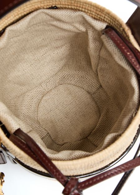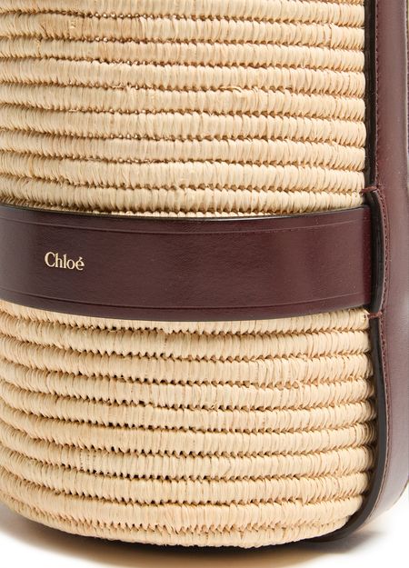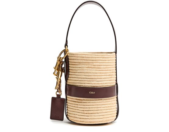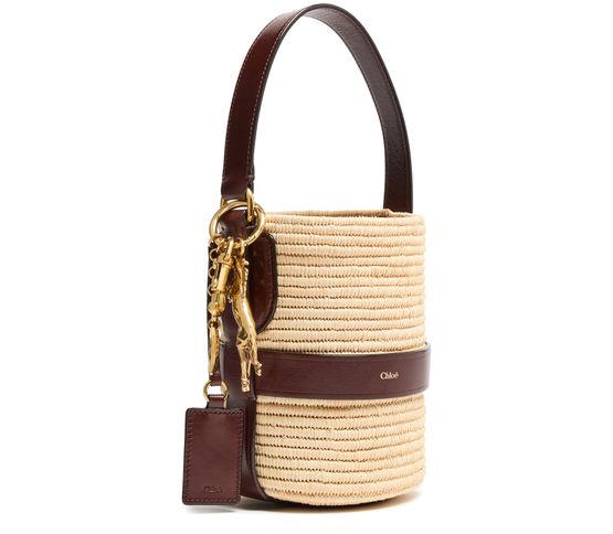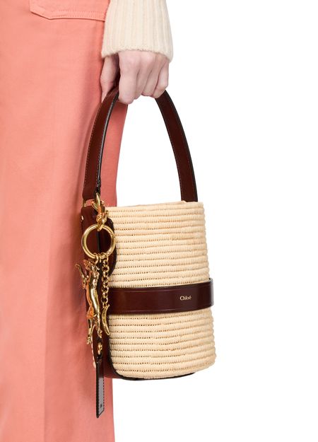 Unveil Chloe's Kerala 25 bucket bag, a stylish companion with a drawstring closure and printed logo. This small bucket bag, featuring a gold finish and visible topstitching, can be hand-carried or worn on the shoulder with its thin strap and single handle.