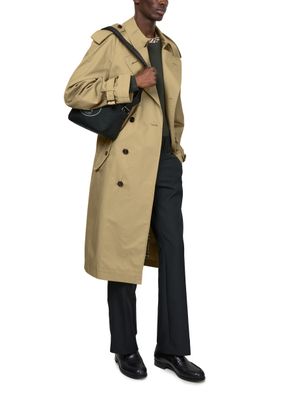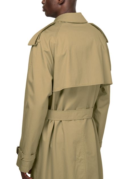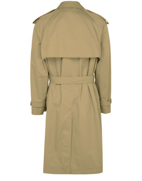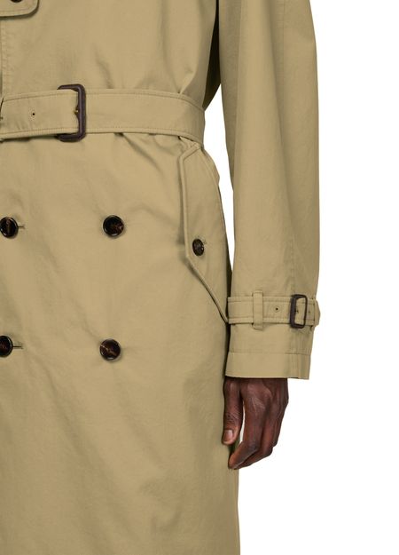 Introducing Burberry Long Cotton Blend Trench Coat. This regular fit, knee-length coat features a classic collar and long sleeves. Its double-breasted front button closure adds a sophisticated touch, while flap pockets offer practical elegance. Perfect for any occasion, it's a timeless addition to your wardrobe.