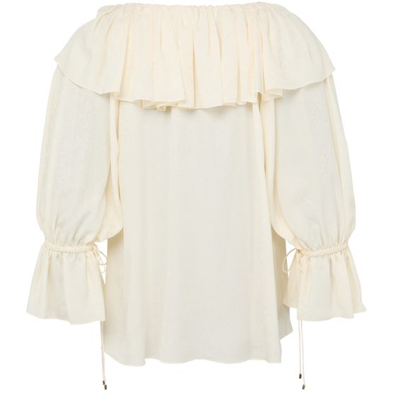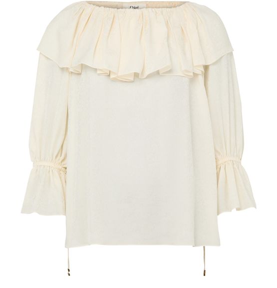 Reveal Chloé's long-sleeved blouse, featuring a graceful boatneck and delicate ruffled sleeves. The refined silhouette and soft drape make it a standout piece, perfect for elevating both casual and sophisticated ensembles with effortless elegance.