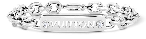 The LV ID Bracelet, new this season, is a stylish take on a classic accessory. Cast from silver-colour finish metal, the substantial chain is centred with a rectangular plaque inscribed with the Louis Vuitton name in perforated lettering. A single crystal is poised on either side of the name for a trendy touch of shimmer.</p>