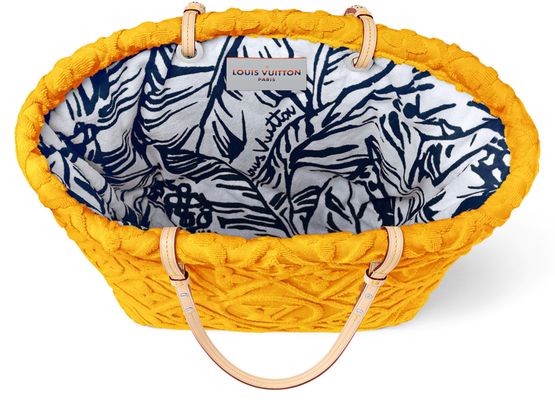Designed for beach lovers, the plush LVacation Tote is made from ultra-supple certified organic terrycloth, with a woven version of the Monogram pattern. The bag is signed with a leather “Louis Vuitton Paris” charm. Inside is cotton lining with a vibrant print. The removable natural cowhide leather trim means the bag is machine washable.