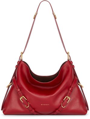 Unveil Givenchy's Medium Voyou bag in shiny leather, a sleek hobo design that encapsulates elegance. Crafted from smooth leather with a single handle, it features a flap closure, zippered interior pocket, and visible topstitching. Adorned with a front logo in gold letters, it exudes sophistication.
