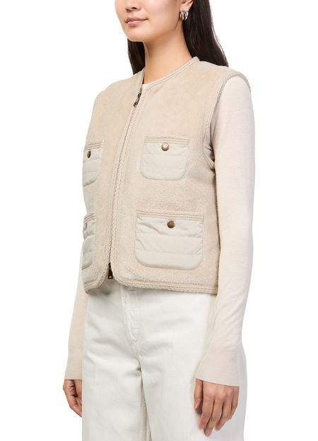 Reveal Moncler's Mimosas sleeveless jacket, a modern essential with a collarless silhouette and sleek zipper closure. The embroidered logo and patch pockets add refined detail, while the sleeveless design offers versatile layering for any occasion. Experience effortless style and comfort in this standout piece.