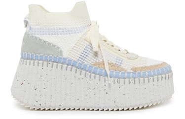 The Nama sneakers from Chloé feature a thick outer sole and round toe for comfort and style. The wedge heel and platform provide a medium heel height with added support. The closed design offers stability, while the embroidered logo and logo at the back add subtle branding. Contrast details add a modern touch to the classic silhouette.