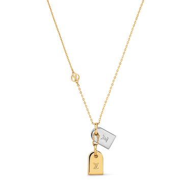 The Nanogram necklace features a distinctive ball chain with two miniature name tags engraved with the LV Initials and iconic Monogram pattern. The design is striking for its combination of gold and silver-color finishes. The supple chain closes with a clasp accessorized with an LV Circle ornament.