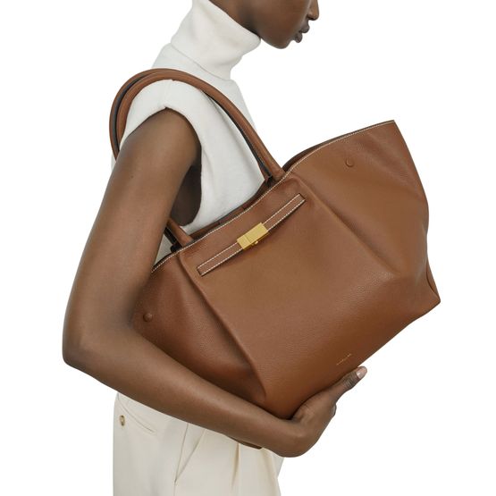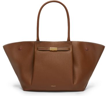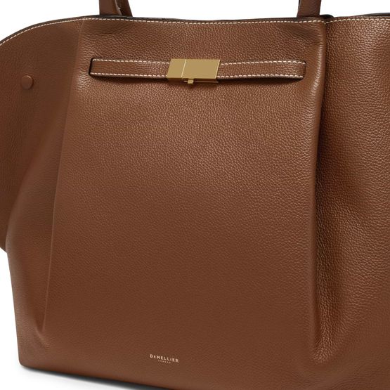 Introducing Demellier's The New York handbag, a refined shopper bag crafted with a magnetic closure and a single compartment for effortless organization. Its gold finish, double handles, and front logo exude sophisticated flair, while the zippered interior pocket and thin strap provide versatile carrying options.