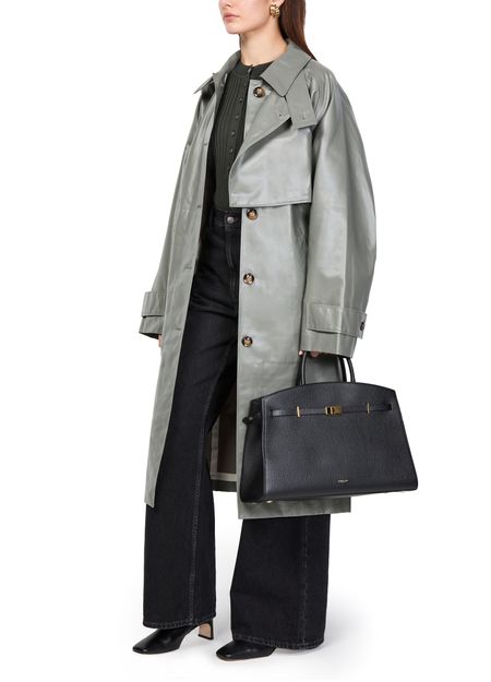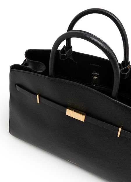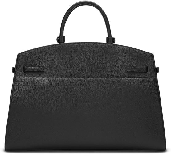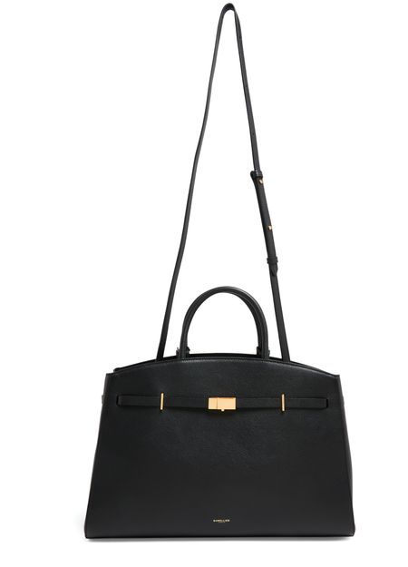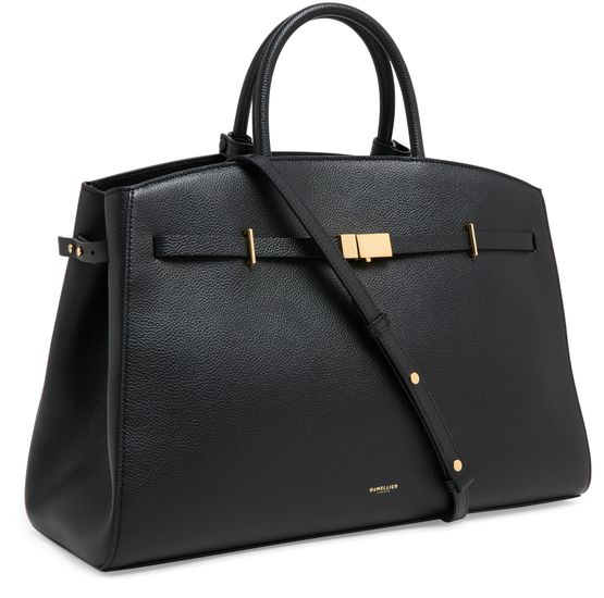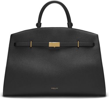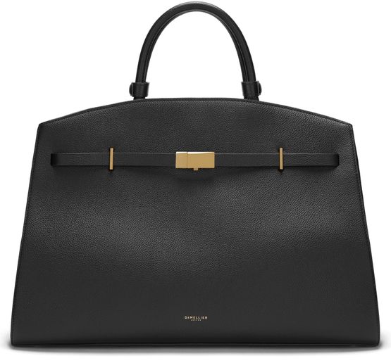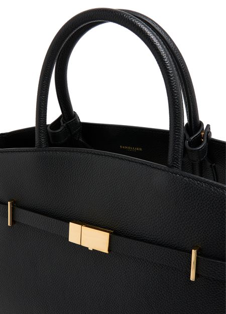 Reveal Demellier's The Hudson handbag, crafted from grained leather with double handles for versatile carrying. The visible stitching and metal finish highlight its refined construction, while a spacious interior compartment and front logo add both function and signature style to this modern shoulder bag.