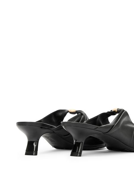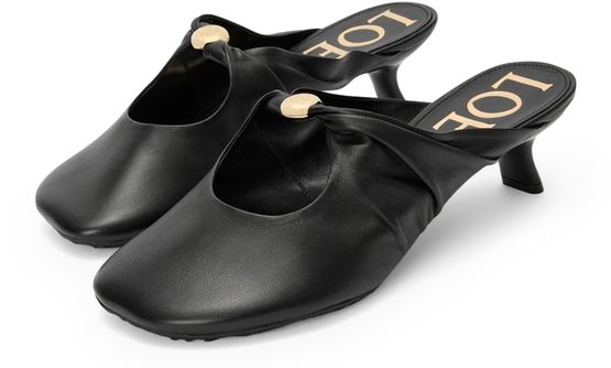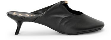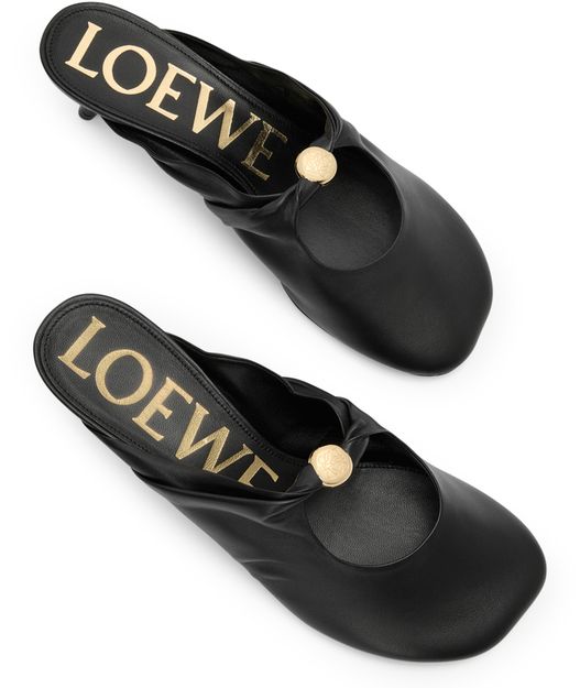 Reveal Loewe's smooth leather mules, crafted with a medium stiletto heel and a closed, round toe for a refined silhouette. The gold-finish logo in gold letters adds a signature touch, while the sleek design ensures a polished look for any occasion.