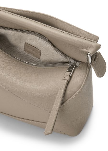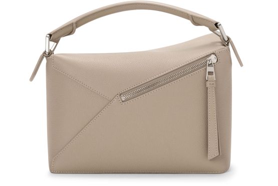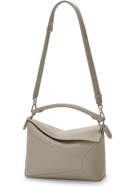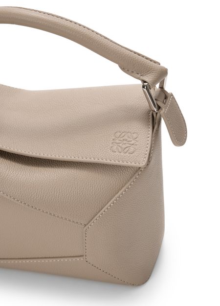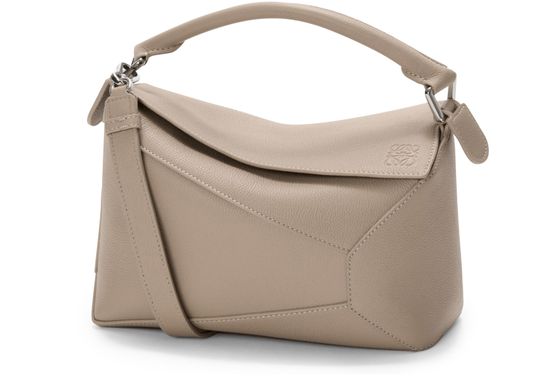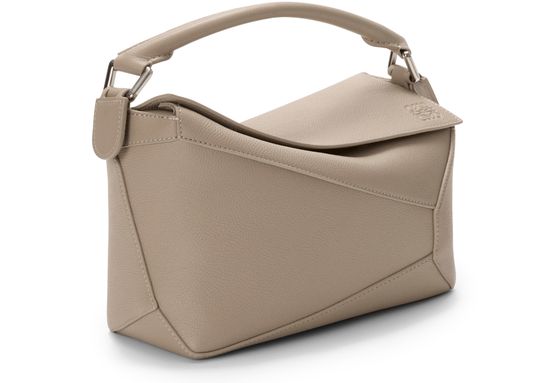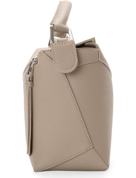 Reveal Loewe's Puzzle Edge small bag, crafted from grained leather with a single handle and metallic finish. Visible stitching and a refined flap closure highlight the brand’s signature craftsmanship, while the compact silhouette offers a modern, versatile accessory for any occasion.