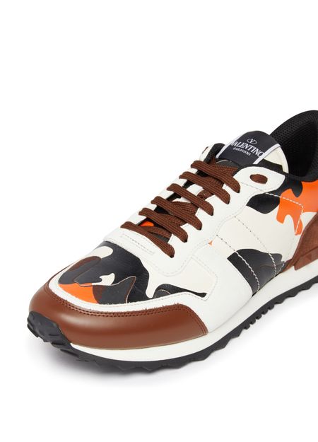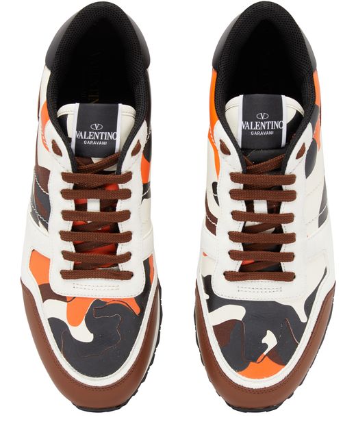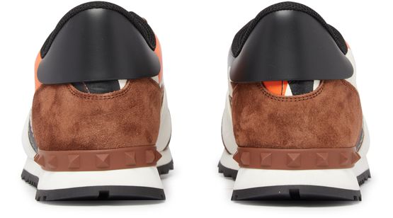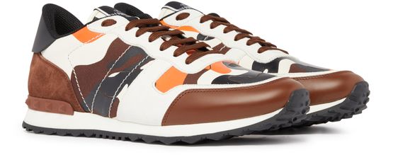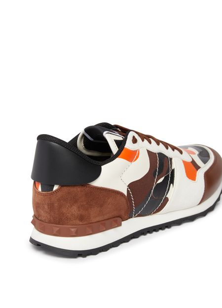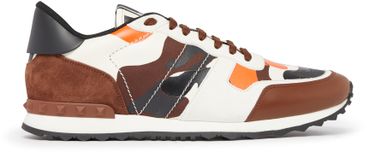 Rockrunner sneakers are lace-up shoes made from smooth and suede leather. They feature graphic cut-outs and visible topstitching. The sneakers showcase Valentino lettering and are adorned with Rockstud decorative studs. They also boast a camouflage pattern and have a thick, notched sole.