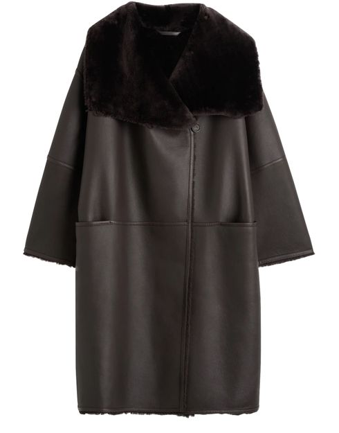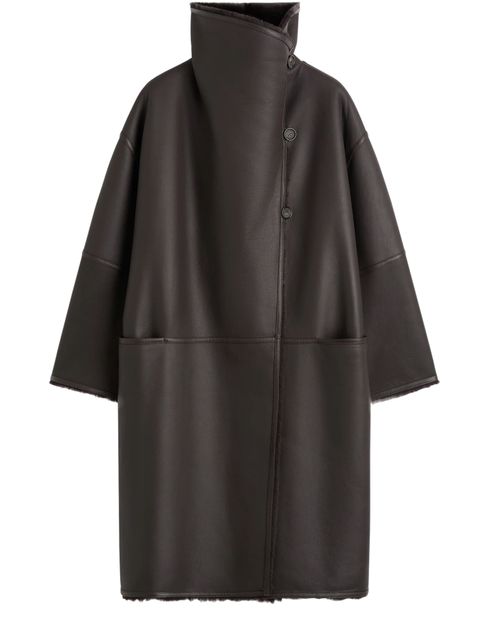 Reveal Toteme's shearling wrap coat, crafted from smooth leather for a refined touch. The long, wraparound silhouette features a double-breasted closure, side pockets, and a classic collar, offering both warmth and sophistication. This versatile piece transitions seamlessly from day to night, elevating any modern wardrobe.