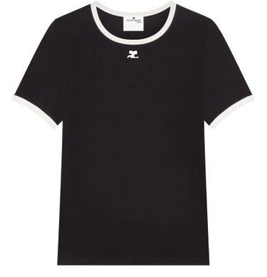 Reveal Courreges's crew neck short-sleeved top, featuring a front logo for a signature touch. The soft fabric and classic silhouette make it a versatile piece, perfect for layering or wearing solo. Pair this top effortlessly with tailored pants or denim for a modern, polished look.
