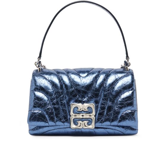 Givenchy's Small 4G Soft bag in quilted laminated leather showcases visible topstitching and a front logo in silver letters. With a magnetic flap closure, this mini bag features a single compartment and an open interior pocket. Its thin strap allows for hand carrying, while the silver finish adds a touch of elegance.