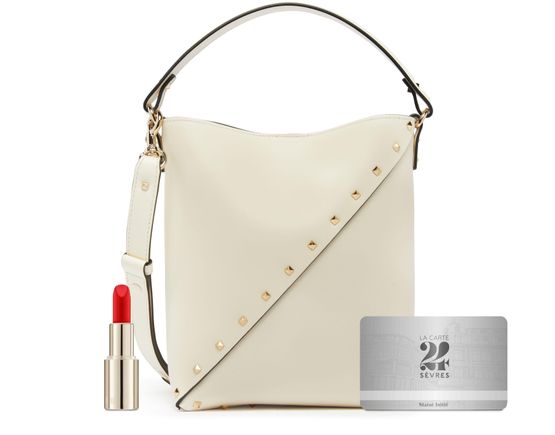 • Description : magnetic closure, gold finish, leather handle, double handles, logo in gold letters, logo on the side, visible topstitching, detachable strap, hand carried, worn crossbody.