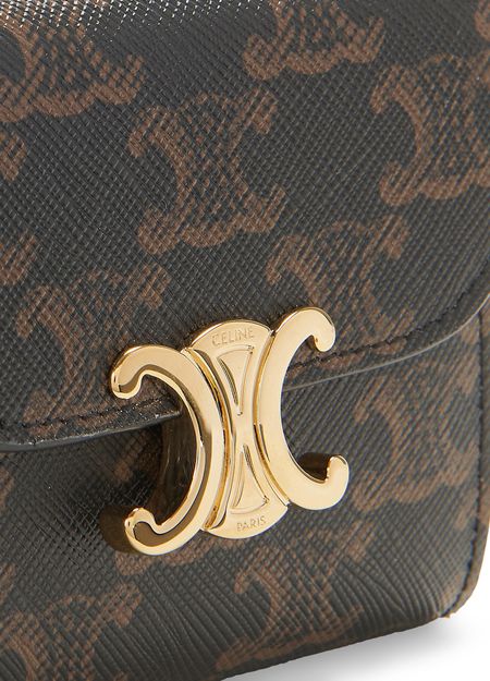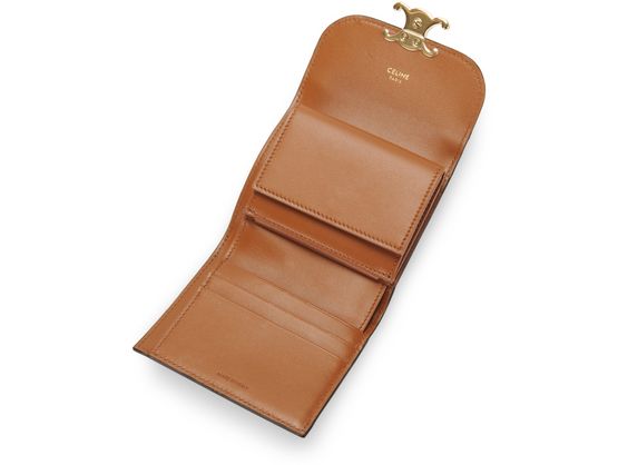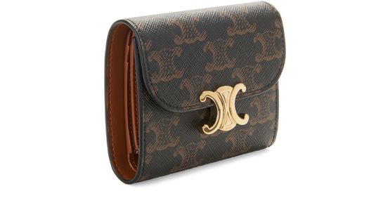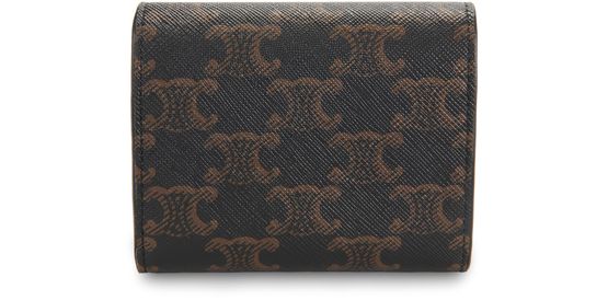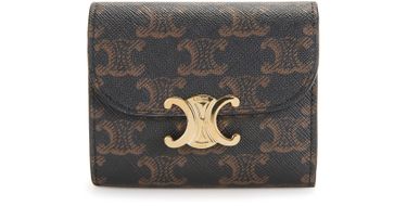Celine's Small Triomphe wallet in Triomphe canvas is a sophisticated accessory that combines elegance with functionality. Adorned with gold metal hardware, it features a TRIOMPHE metallic snap button closure. With a folded coin pocket, five credit card slots, and a note pocket, it effortlessly marries style and practicality for the modern individual.