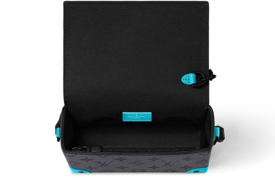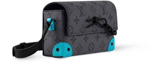 The Steamer Wearable Wallet takes on a summery feel in Monogram Eclipse Reverse canvas with colored cowhide-leather trim. The adjustable strap and reinforced corners are in a vivid turquoise, bringing a jolt of color to the monochromatic canvas. The hardware, including the signature pin-and-chain closure and the rivets on the reinforced corners, are black.