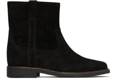 Isabel Marant Susee boots feature a suede high-top upper with a pull-on design for easy wear. The boots have a very thin sole and a square heel, providing a sleek and modern look. These boots are perfect for adding a touch of sophistication to any outfit.