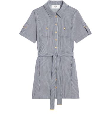 Celine's Trapeze mini dress is a stylish blend of sophistication and casual charm. Crafted in soft cotton, it features a classic fit and mini length, complemented by a crisp shirt collar. With rounded patch pockets and elegant Triomphe buttons, this dress embodies effortless elegance, perfect for any occasion.