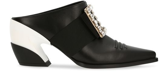 A bold heel and buckle studded with crystals make the Viv Tex Strass mules by Roger Vivier an elegant must-have for women to savour.