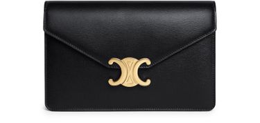 Celine's Wallet on chain Triomphe in shiny calfskin is a stunning blend of elegance and practicality. With its sleek design and versatile carrying options, it effortlessly transitions from hand carry to shoulder and cross-body styles. The Triomphe metallic snap button closure reveals a spacious compartment, six credit card slots, and a flat pocket, making it a perfect companion for any occasion.