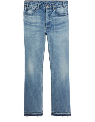 Celine Wesley jeans in pismo wash denim offer a relaxed vibe with their loose fit and low-rise design. The straight leg silhouette features five pockets adorned with rivets, while the back showcases a stylish patch at the waist. Released hems add a trendy touch, complemented by Celine's jeans-engraved zipper and button, making these jeans a must-have for effortless style.