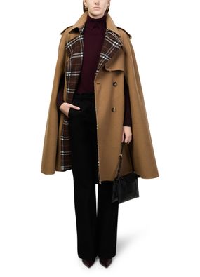 Reveal Burberry's Wool Belmont Trench Cape where elements from the brand's iconic trench are reconstructed and made from double-faced wool twill. The silhouette features epaulettes, a gun flap and B buckle belt, whilst an archival coat inspires the curlicue shape of the pockets. Cut to a regular fit with a contrasting Burberry Check inner and lapels.