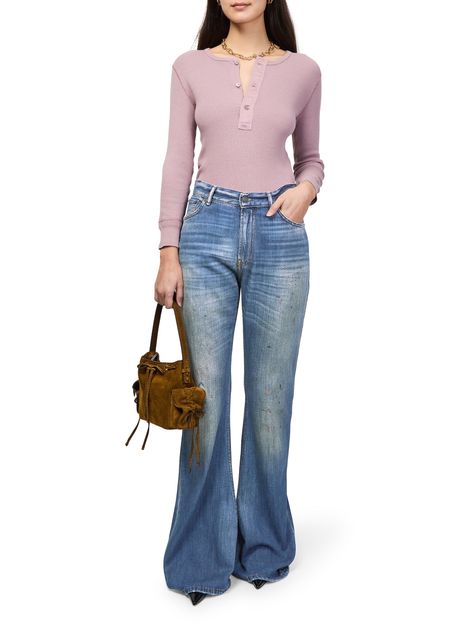 • Description : Bootcut, faded denim, two front pockets, visible stitching, buttoned zipper closure, belt loops.