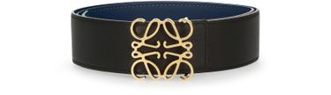 Loewe's 4 cm Anagram belt is made of 4 cm-wide grained calfskin leather, stitched in black and featuring a metallic belt buckle in the shape of the brand's logo. It is available in two color combinations, light brown with black lining and black with midnight blue lining.