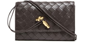 Reveal Bottega Veneta's Andiamo clutch with shoulder strap, showcasing the iconic Intrecciato weaving technique and refined gold clasp. The thin strap and embossed logo add a modern touch, while the open interior pocket ensures effortless organization. Gold-finish details complete this sophisticated crossbody statement.