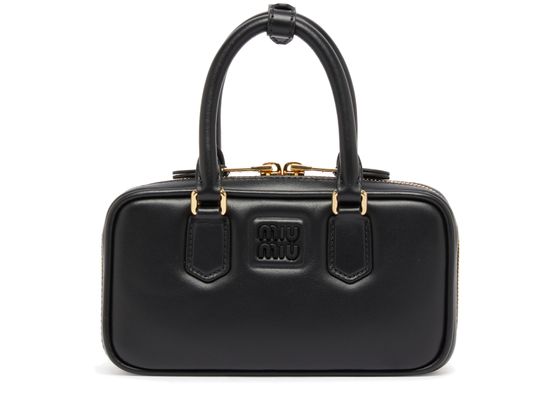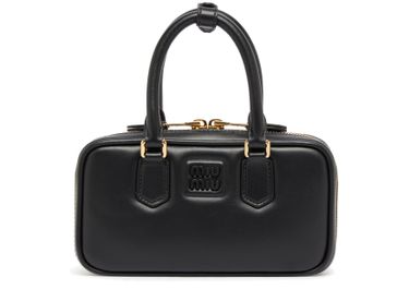Miu Miu's Arcadie leather mini bag showcases a chic silhouette with a zipper closure and a single compartment for essentials. Adorned with a front logo and embossed details, it features elegant visible topstitching. Hand carried or worn with a thin strap, the double handles add versatility to this stylish accessory.