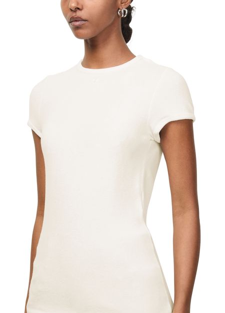 Reveal Courreges's Baby Spongy short sleeved t-shirt, featuring a crew neck and short sleeves for a modern silhouette. The soft texture is elevated by an embroidered chest logo, making this top a versatile choice for effortless styling, whether paired with denim or tailored pieces.