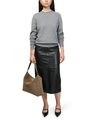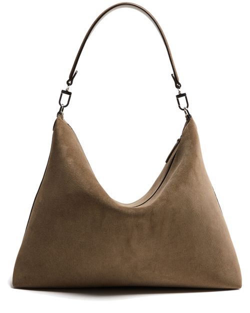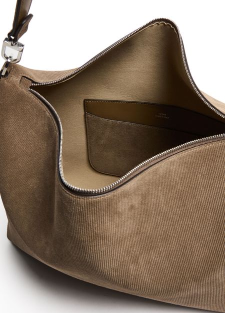 Reveal Toteme's Bevel medium bag, a refined shoulder bag crafted from supple corduroy-effect suede with a single handle. Visible stitching and a streamlined silhouette highlight its modern design, while a secure zipper closure and interior patch pockets offer both style and practicality.