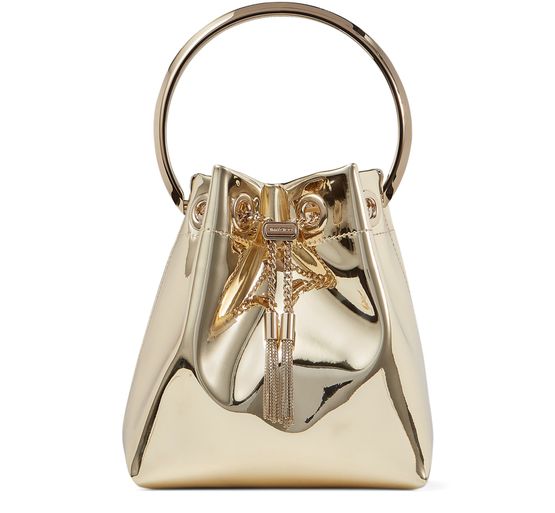 Jimmy Choo's Bon Bon bucket bag features a single strap for hand-held or over-the-shoulder wear. It is adorned with a decorative chain link and sliding buckle closure. The bag is finished with an engraved logo and fringed trim for added style. This versatile and chic accessory is perfect for any occasion.