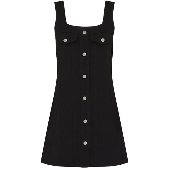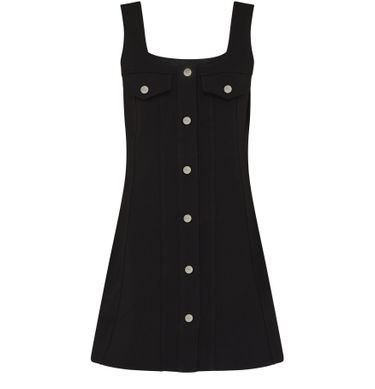 Ganni's Bonded crepe mini dress showcases a sleeveless pinafore design with a rectangular neckline. Its front buttoned closure adds a touch of sophistication, while visible stitching highlights the craftsmanship. Perfect for any occasion, this midi dress effortlessly blends style and comfort, making it a must-have for your wardrobe.