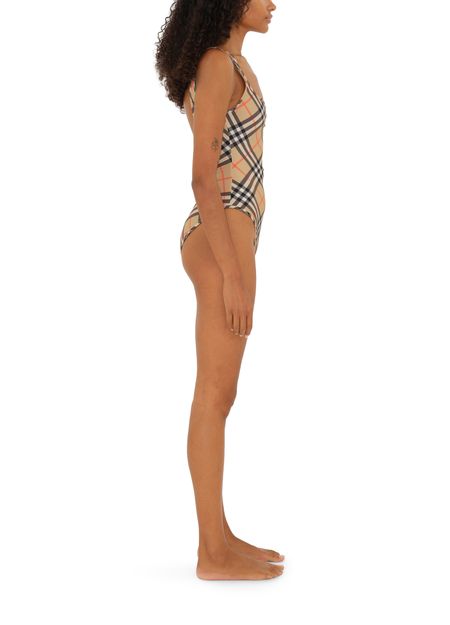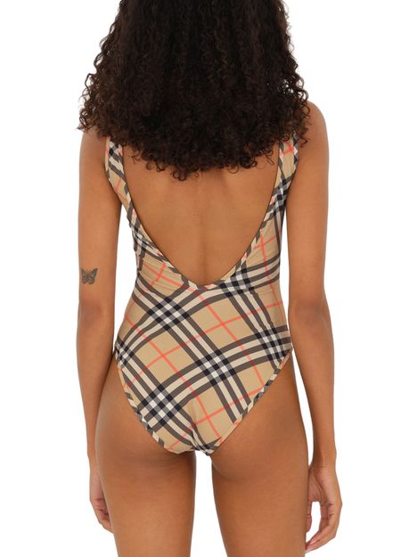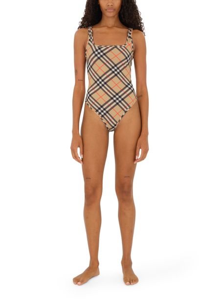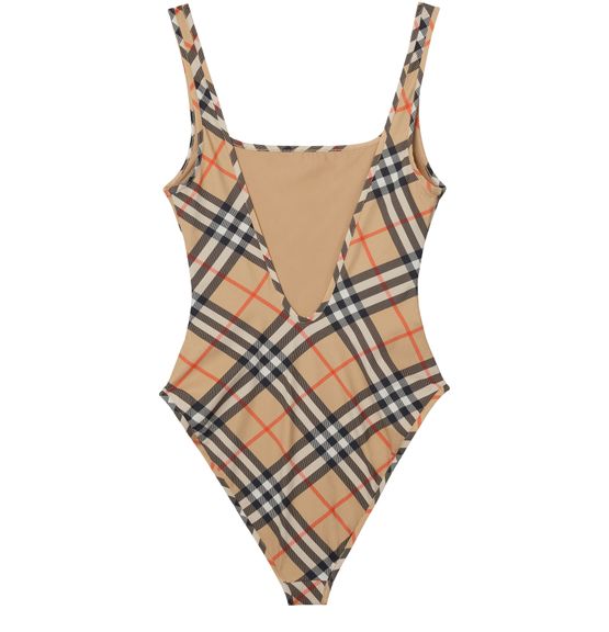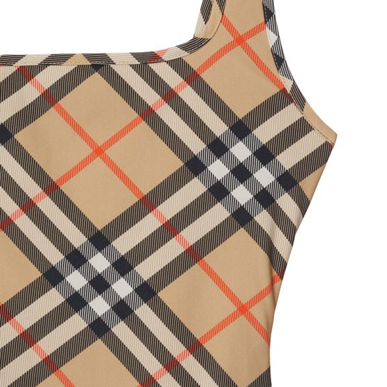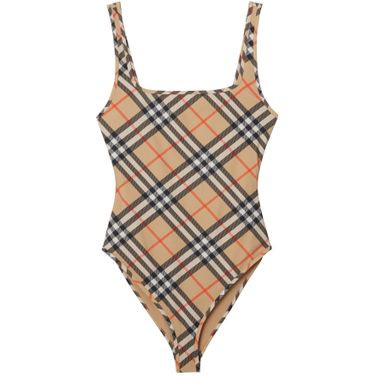 Reveal Burberry's check swimsuit, where a striking checked pattern meets a sleek rectangular neckline and refined shoulder straps. The contrast lining adds a modern twist, making this piece perfect for poolside lounging or sun-soaked escapes.