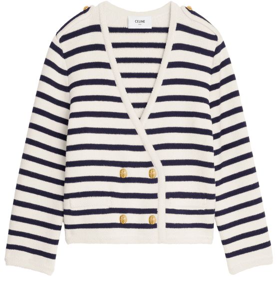 Celine's Cropped in marinière wool cardigan redefines elegance with its classic fit and cropped length. Featuring a flattering v-neck and long sleeves, it boasts braided piping details and two shoulder tabs. The two welt pockets and four signature Celine blason buttons enhance its charm, making it a must-have piece made in Italy.