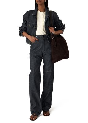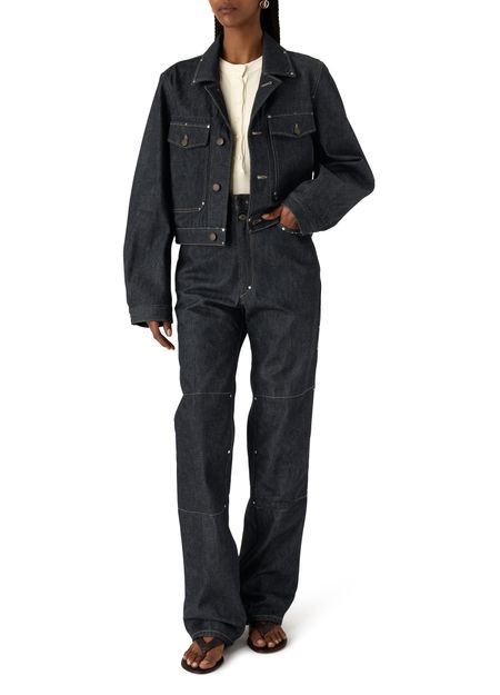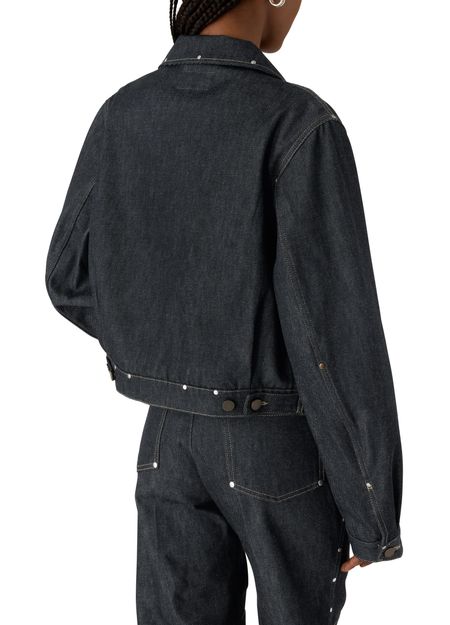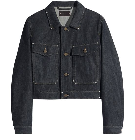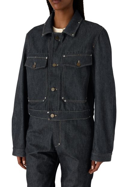 Reveal Lemaire's cropped blouson with studs in denim, defined by its front buttoned closure and long sleeves. Flap pockets and studded details add a modern edge, while topstitched edges refine the silhouette. This versatile piece transitions effortlessly from day to night, making it a standout in any wardrobe.