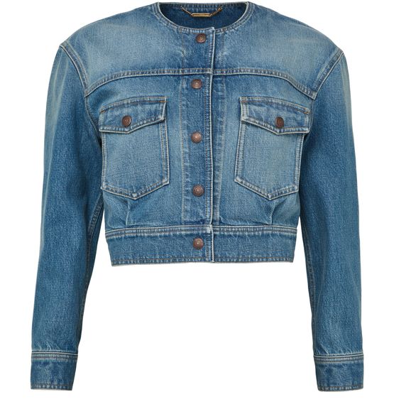 Reveal Chloe's denim jacket, a cropped trucker silhouette with a collarless neckline and long sleeves. The front buttoned closure and flap pockets add practical flair, while a faded effect and a logo-embellished back label elevate its modern appeal. Perfect for versatile, effortless styling.