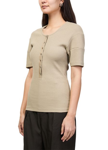 Reveal Lemaire's fitted Henley t-shirt, featuring a round neck and short sleeves for a streamlined silhouette. The button fastening adds a refined touch, while the tailored fit ensures effortless pairing with both casual and elevated looks. Experience modern versatility in this essential top.