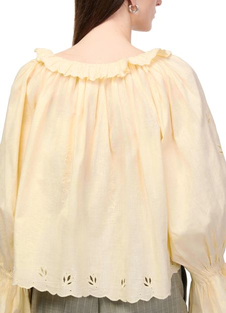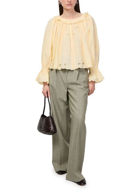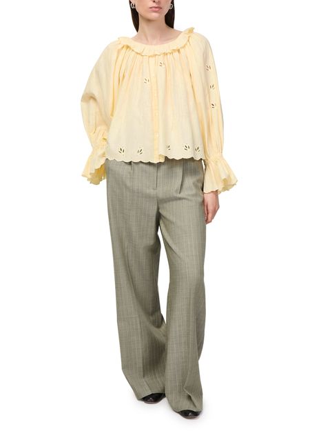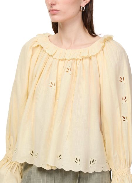 Reveal Skall Studio's fleurie blouse, a refined top featuring a round neck and long sleeves. The front buttoned closure adds a polished touch, while the delicate floral pattern elevates its modern appeal. Perfect for pairing with tailored pants or denim for versatile, effortless style.