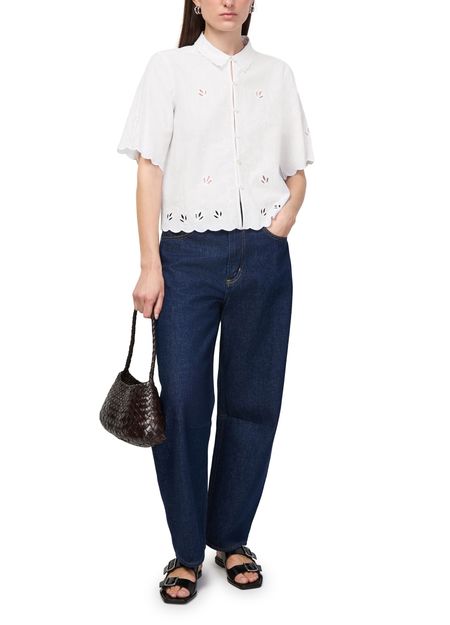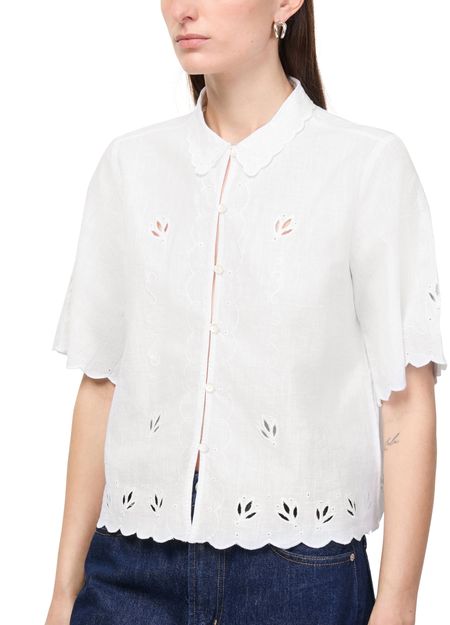 Reveal Skall Studio's fleurie shirt, featuring a refined round neck and short sleeves for a fresh, modern silhouette. The front buttoned closure adds a polished touch, while the delicate floral pattern makes this top a versatile choice for both casual and elevated ensembles.