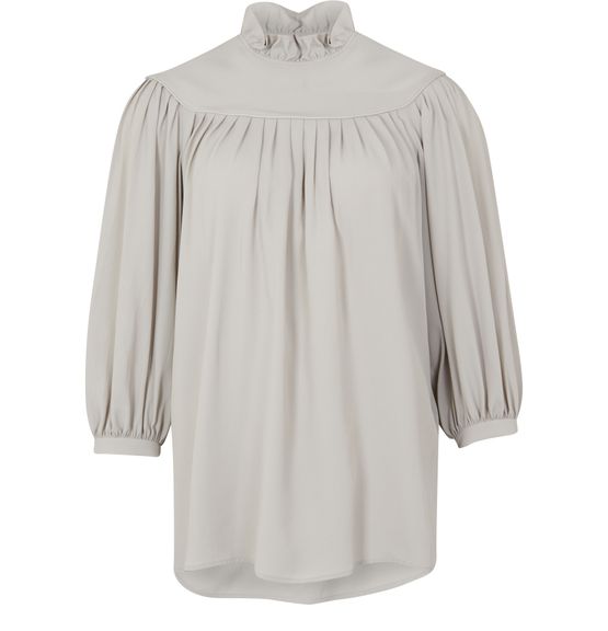 Celine's Fluid blouse embodies effortless elegance with its ruffled mock neck and button fastening at the back. Three-quarter puffed sleeves add a whimsical touch, while gathering under the plastron enhances its silhouette. Finished with pearly buttons at the cuffs, this blouse promises a comfortable fit that elevates any ensemble.