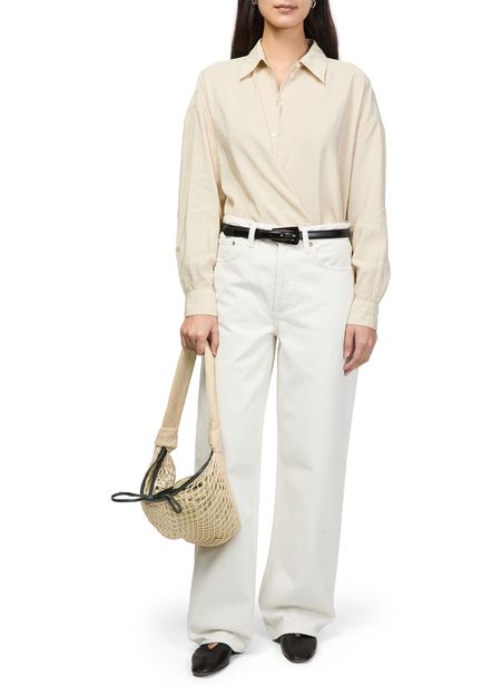 Reveal Lemaire's Fortune Croissant shoulder bag, crafted in open weave for a distinctive texture. The single handle and drawstring closure offer both style and practicality, while the sculptural silhouette embodies modern sophistication. This piece seamlessly blends innovative design with everyday functionality.
