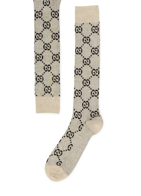 With a confidently vintage style that features subtle, discreet gridlines in the background, these high socks proudly display prestigious fashion house Gucci's signature GG.