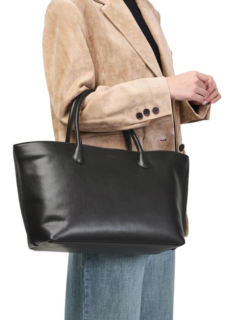 • Description : Shopper / tote bag, double handles, leather handle, thin strap, front logo, smooth leather, visible topstitching, metal finish.